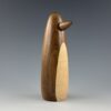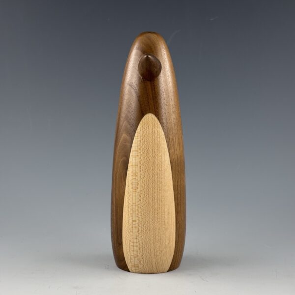 This big guy is turned on a lathe from a blank I glued up from black walnut for the body and maple for the belly. The beak is also turned from black walnut. I sand it all super smooth and then apply a durable wax finish.