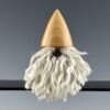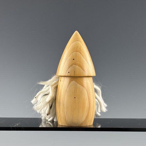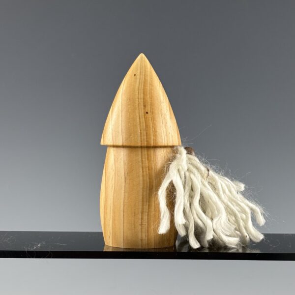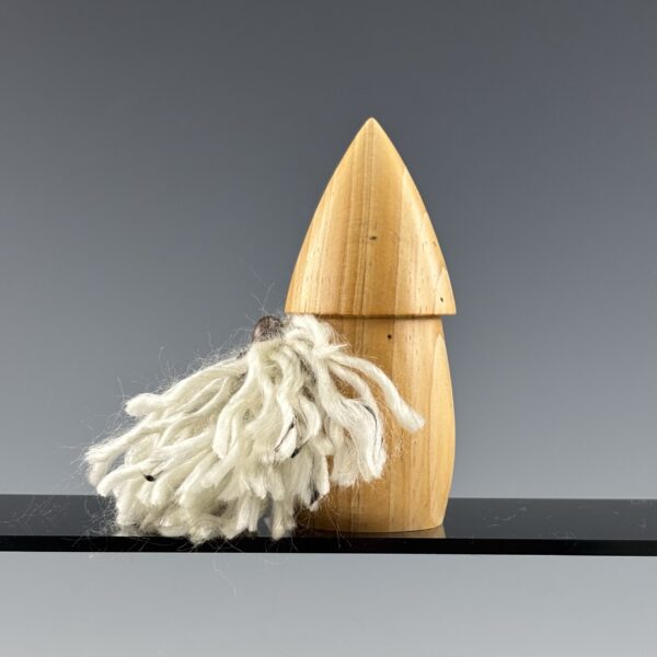 The Small White Wizard is turned from an unknown conifer species I rescued from its previous life as a pallet. I turned his nose from black walnut and his beard is made from soft white acrylic yarn with black streaks.