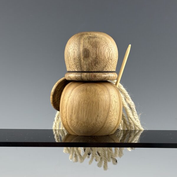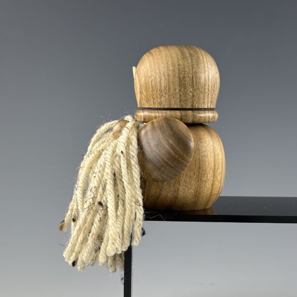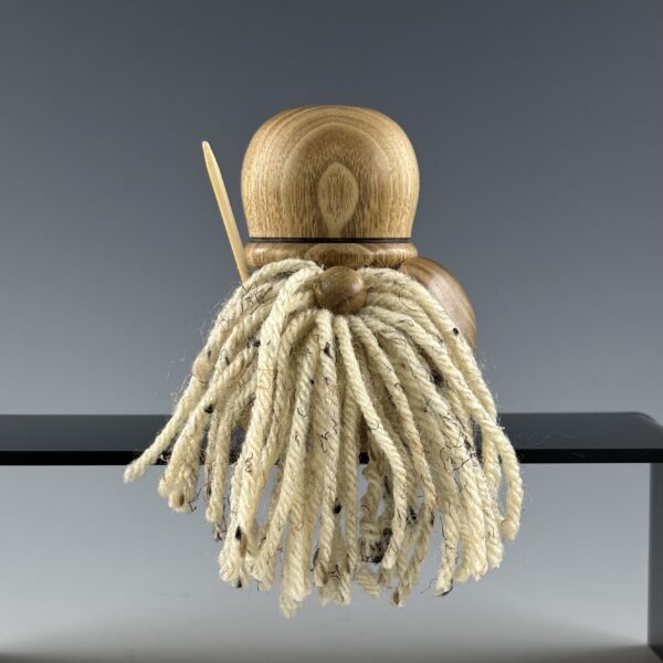The Warrior is a stocky little fireplug of a Gonk, ready for whatever comes next! His body, helmet, nose, and shield are all turned from butternut, sometimes known as white walnut as they are in the same family. He’s got a skewer spear opposite his shield and I friction burned a line on his hemet to pull out some of the darker grain features in the butternut. His beard is made from acrylic yarn and you probably need him by your side!