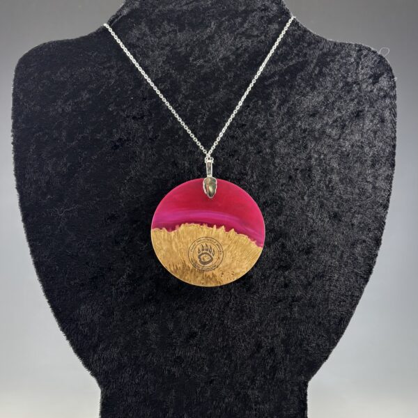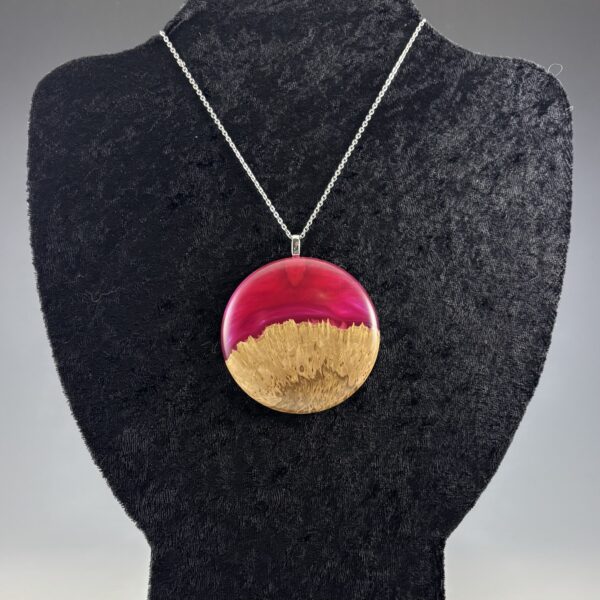 Large Pink/Magenta Resin & Mallee Burl Pendant – 2.5″ diameter