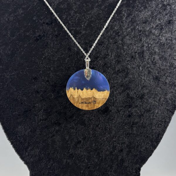 These wood/burl hybrid pendants are the result of a multi-step process that begins with creating a blank in a cubical silicone mold. I cut a piece of mallee (eucalyptus) burl and secure it to the bottom of the mold with a little hot glue, then I mix a batch of epoxy resin and tint it with mica powder. The mold is then put in a pressure pot to remove any bubbles in the resin and once the cube is cured, I cut it into slices about 0.5-0.75″ thick. Using a circle drafting template I lay out the location for the pendant and cut off the corners on the bandsaw. Then I mount the slice to a wood mandrel I made for my 4-jaw chuck on my lathe. Using mostly negative rake scrapers I turn the slice into the final shape of the pendant. Then I sand the pendant through 600 grit, smooth it even further with abrasive sanding paste, and seal the burl portion with shellac. The pendant is finished with a 3-part buffing system which includes 2 more abrasive grits and is topped off with a coat of carnuba wax. This attention to detail results in a piece that is looks and feels amazing.