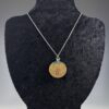 These wood/burl hybrid pendants are the result of a multi-step process that begins with creating a blank in a cubical silicone mold. I cut a piece of mallee (eucalyptus) burl and secure it to the bottom of the mold with a little hot glue, then I mix a batch of epoxy resin and tint it with mica powder. The mold is then put in a pressure pot to remove any bubbles in the resin and once the cube is cured, I cut it into slices about 0.5-0.75″ thick. Using a circle drafting template I lay out the location for the pendant and cut off the corners on the bandsaw. Then I mount the slice to a wood mandrel I made for my 4-jaw chuck on my lathe. Using mostly negative rake scrapers I turn the slice into the final shape of the pendant. Then I sand the pendant through 600 grit, smooth it even further with abrasive sanding paste, and seal the burl portion with shellac. The pendant is finished with a 3-part buffing system which includes 2 more abrasive grits and is topped off with a coat of carnuba wax. This attention to detail results in a piece that is looks and feels amazing.