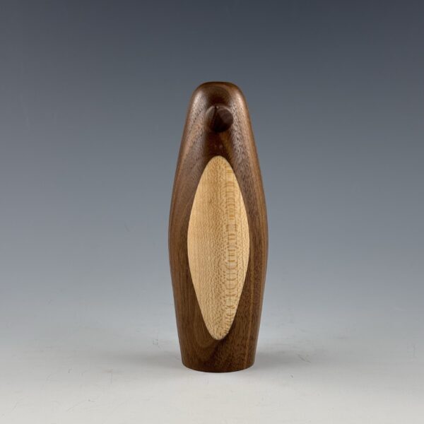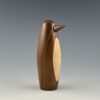 This penguin is turned on a lathe from a blank I glued up from black walnut for the body and maple for the belly. The beak is also turned from black walnut. I sand it all super smooth and then apply a durable wax finish.