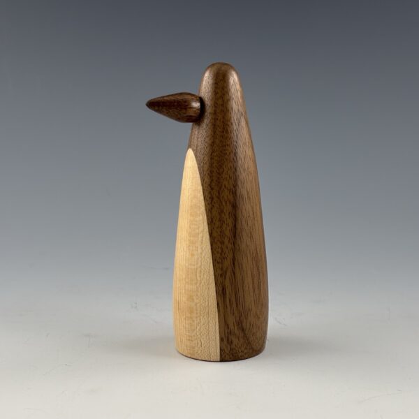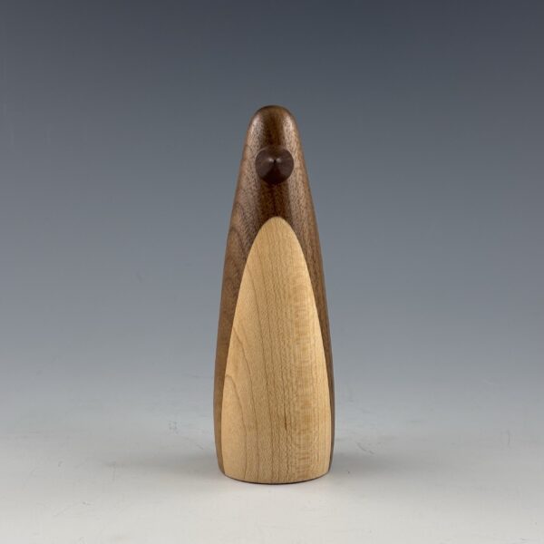 This penguin is turned on a lathe from a blank I glued up from black walnut for the body and maple for the belly. The beak is also turned from black walnut. I sand it all super smooth and then apply a durable wax finish.
