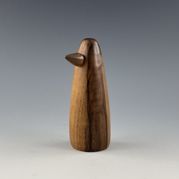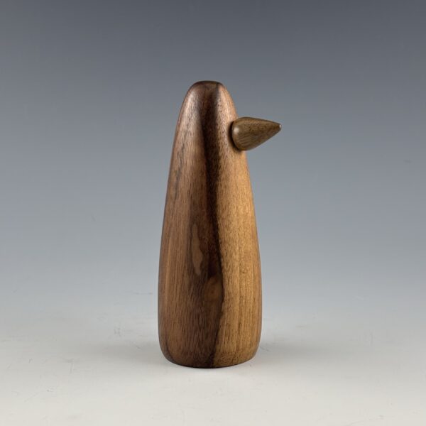This penguin is turned on a lathe from a blank of black walnut and one of only two I didn’t use maple for the belly. This piece of walnut had a little bit of sapwood and spalting and figure so I decided it was too pretty to change. The beak is also turned from black walnut. I sand it all super smooth and then apply a durable wax finish.