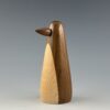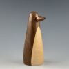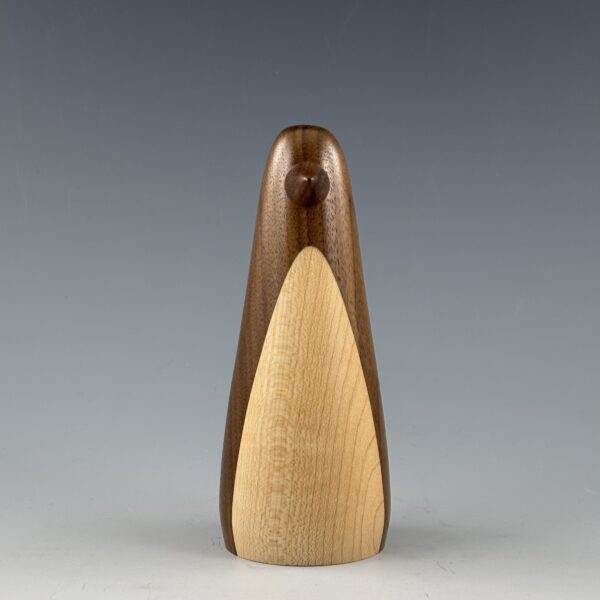 This penguin is turned on a lathe from a blank I glued up from black walnut for the body and maple for the belly. The beak is also turned from black walnut. I sand it all super smooth and then apply a durable wax finish.