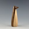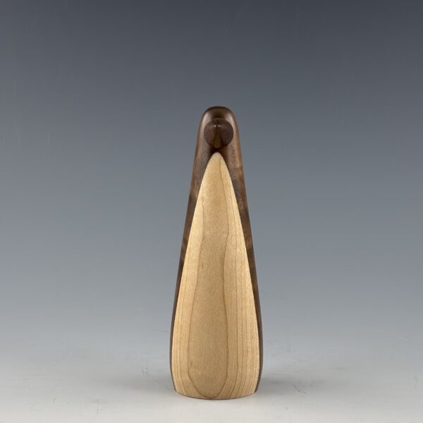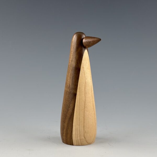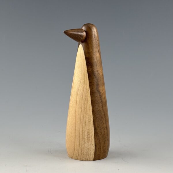 This penguin is turned on a lathe from a blank I glued up from black walnut for the body and maple for the belly. The beak is also turned from black walnut. I sand it all super smooth and then finish with a durable wax finish.