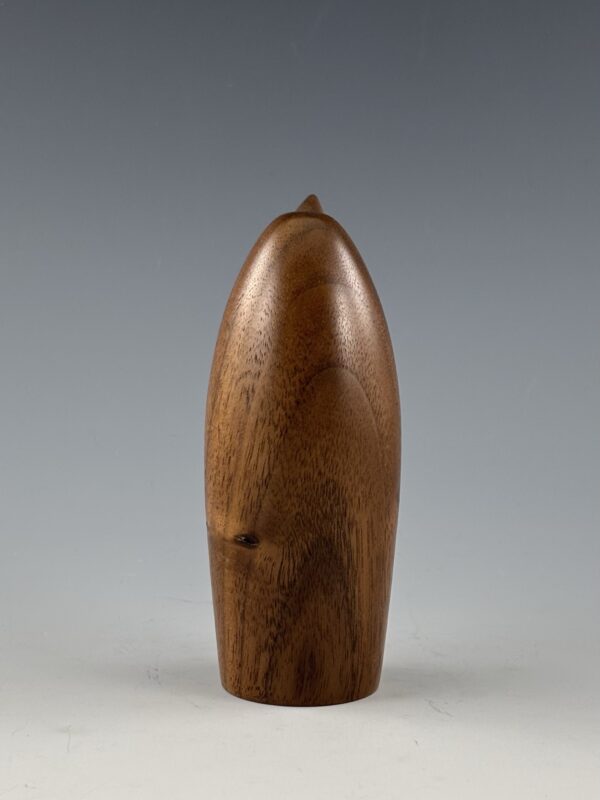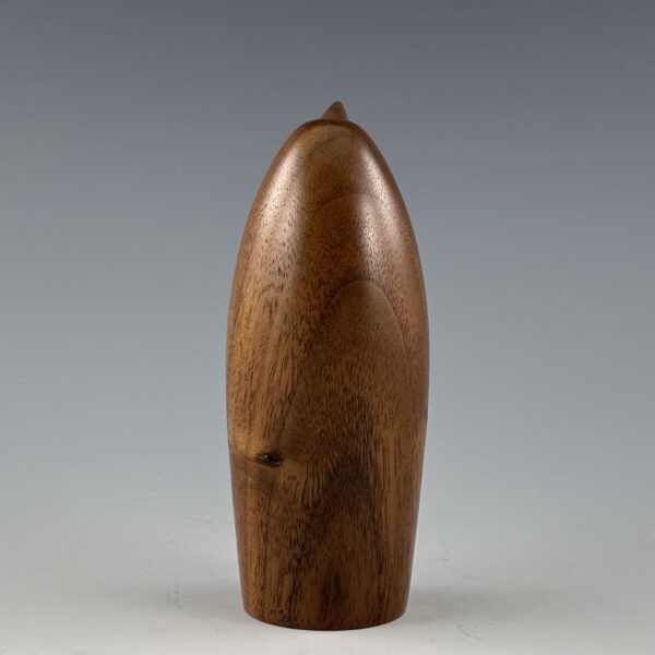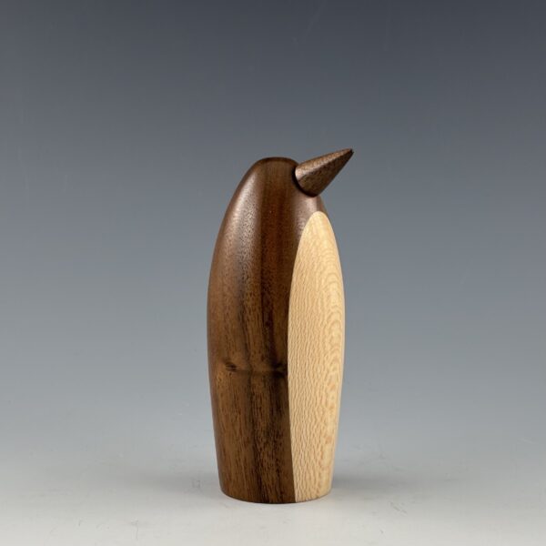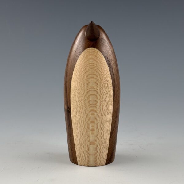 This penguin is turned on a lathe from a blank I glued up from black walnut for the body and quartersawn sycamore for the belly. The beak is also turned from black walnut.